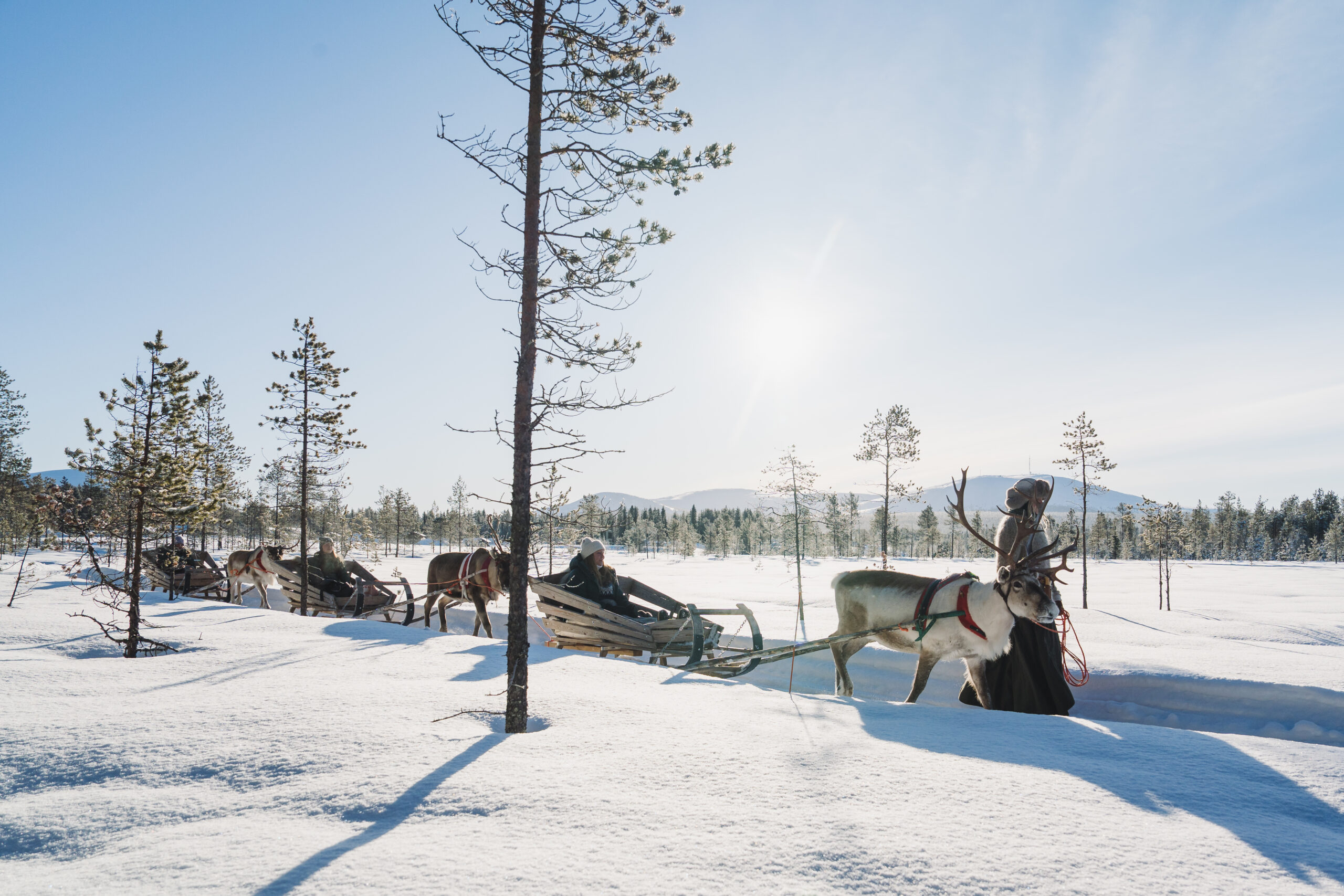 A traditional reindeer sleigh ride around the surrounding nature at Jänkä Resort & Ranch Ylläs.